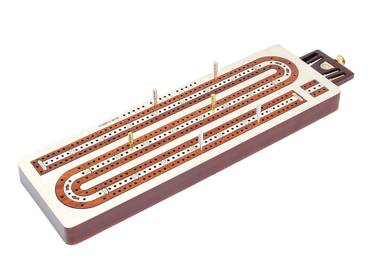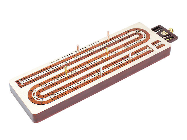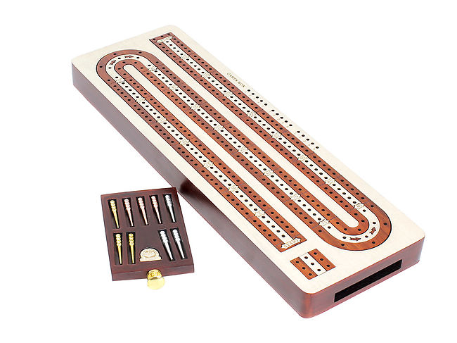 House of Cribbage presents 3 track (120 Points) Continuous Cribbage Board made for up to 3 players. The board measures 12.5" x 4" x 1" (Inch) and can be used to play games between a pair of players or a trio.